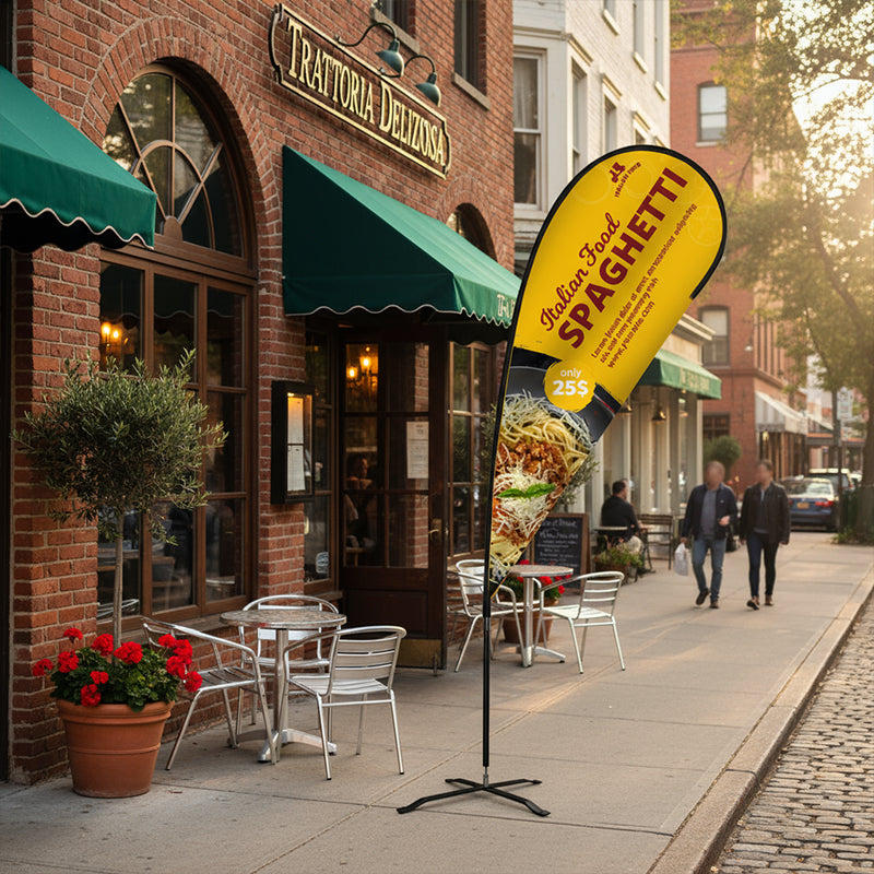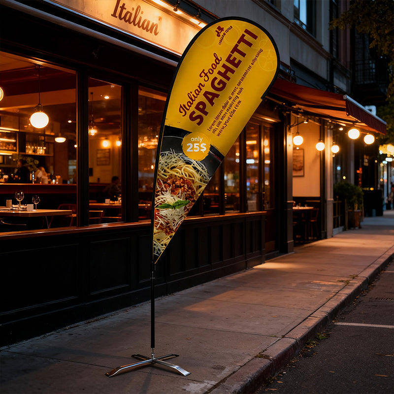 Featuring a flexible aerodynamic pole and full-colour single-sided printing, the 12 teardrop flag turns heads with fluid motion and standout graphics. Choose your base (ground spike, platform, or weighted base) based on the surface and location. Whether you’re directing foot traffic, advertising a sale, or branding an event, this flag gives you the height and impact you need with minimal footprint.